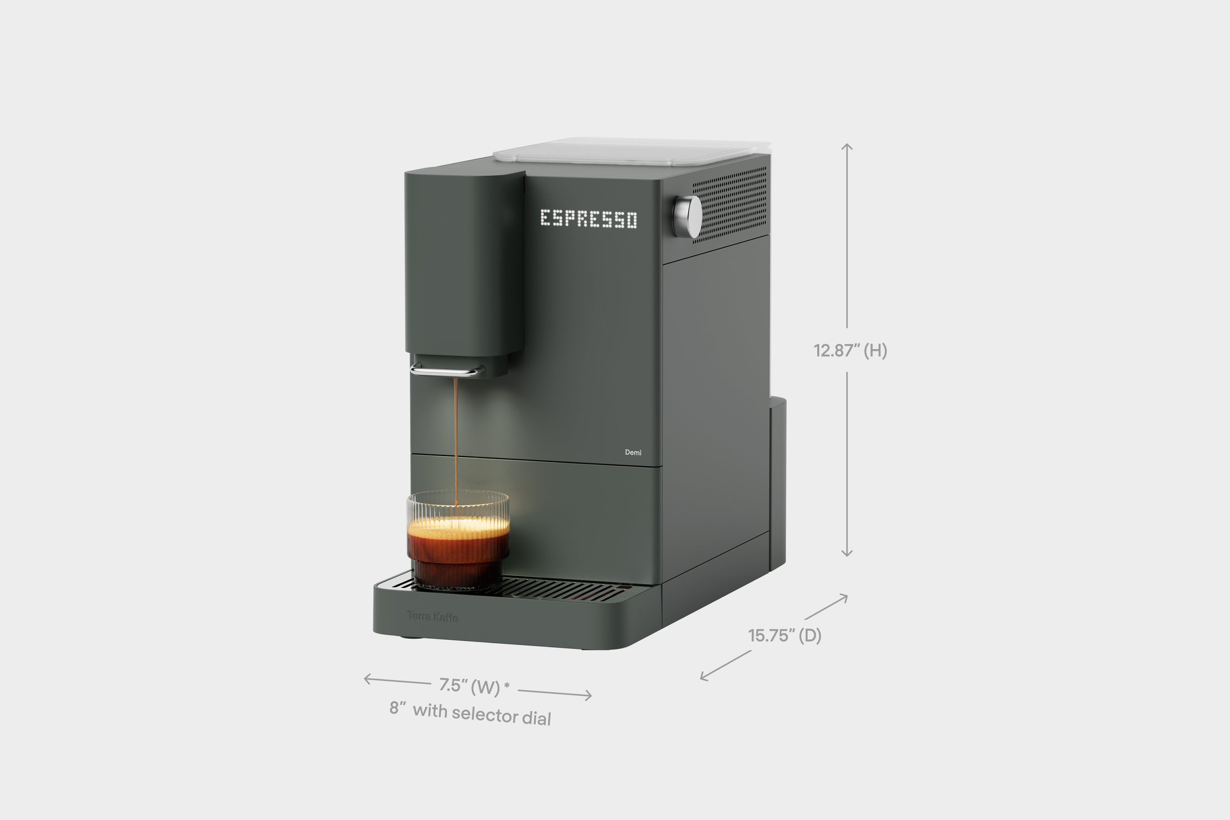 Adjust Demi’s polished stainless steel spout handle to fit your drinkware, then turn the matching dial to customize your espresso—stronger, hotter, bigger, smaller. Control every brewing parameter to match your exact taste.